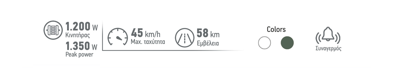Τελική ταχύτητα 45 Km/h _ Κινητήρας 1200 W _ Αυτονομία 60 έως 80 Km _ Χωρίς Δίπλωμα
