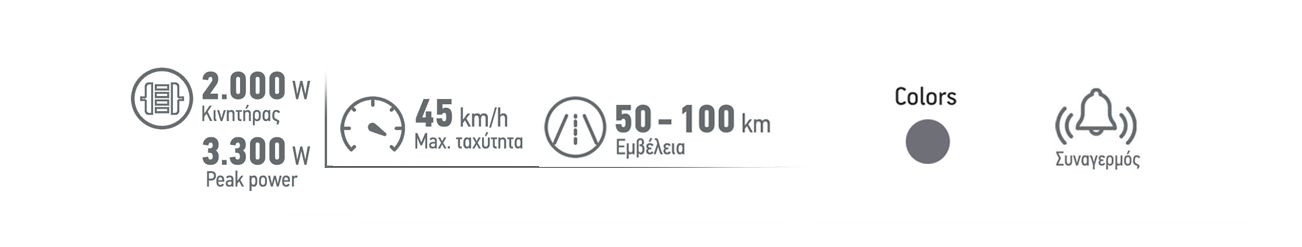 Τελική ταχύτητα 45 Km/h _ Κινητήρας 2000 W _ Αυτονομία 60 έως 80 Km _ Με Δίπλωμα
