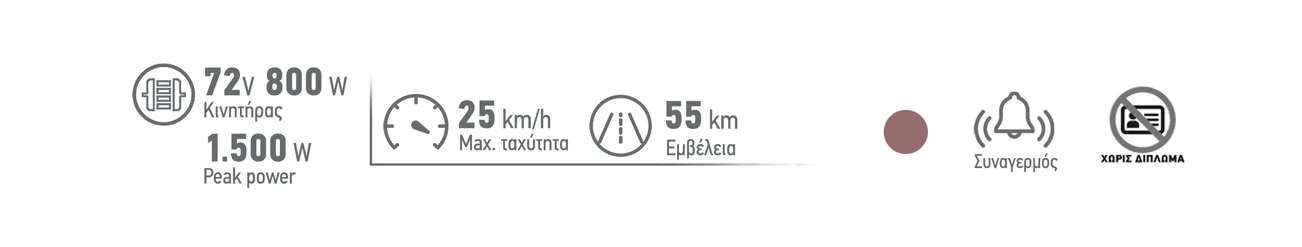 Τελική ταχύτητα 25 Km/h _ Κινητήρας 800 W _ Αυτονομία 60 έως 80 Km _ Χωρίς Δίπλωμα